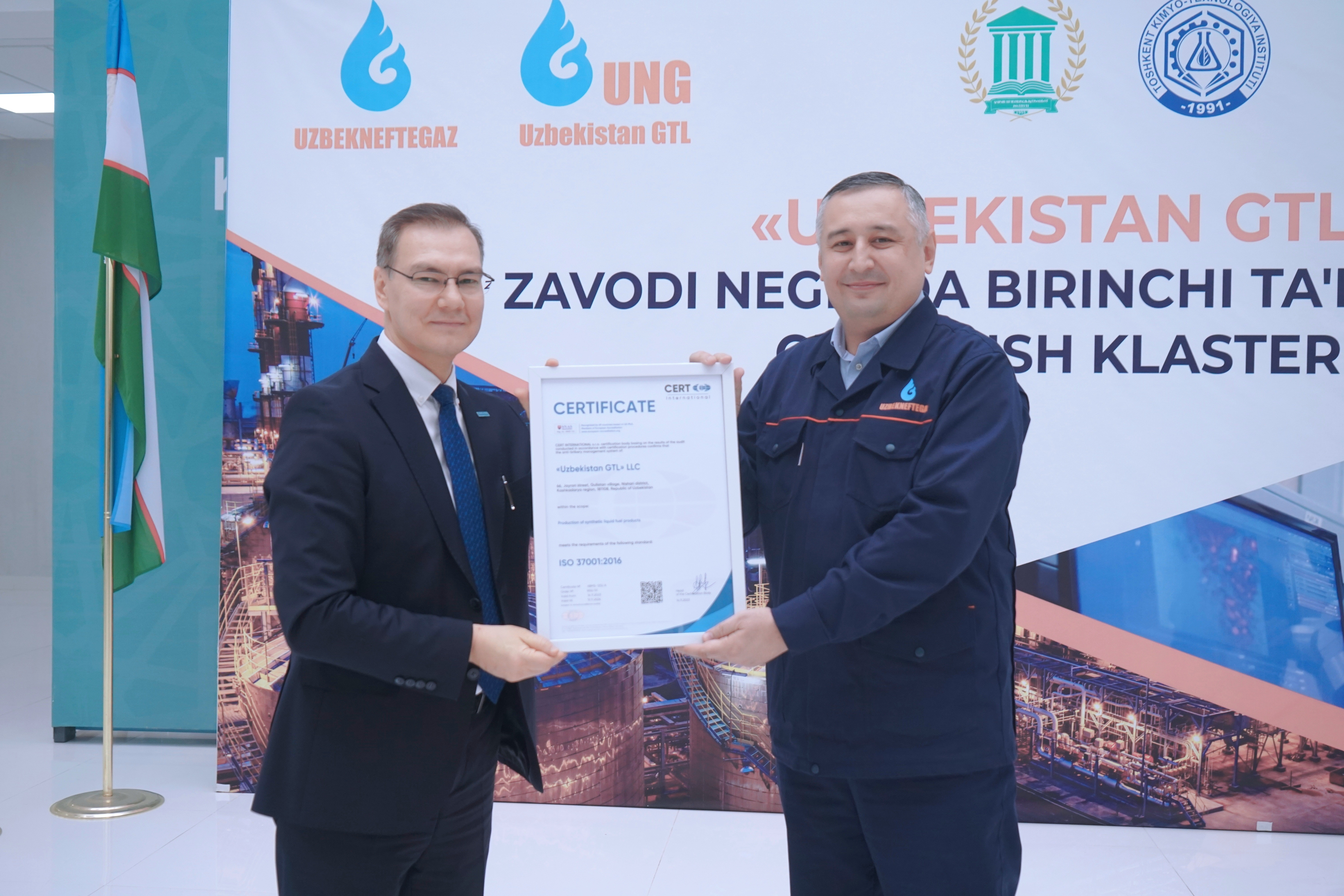 Завод "Uzbekistan GTL" получил сертификат международного стандарта ISO 37001:2016 «Система антикоррупционного менеджмента”.